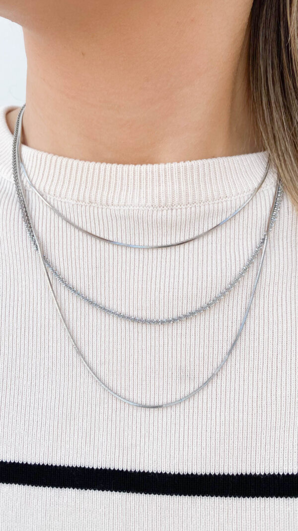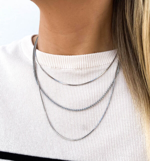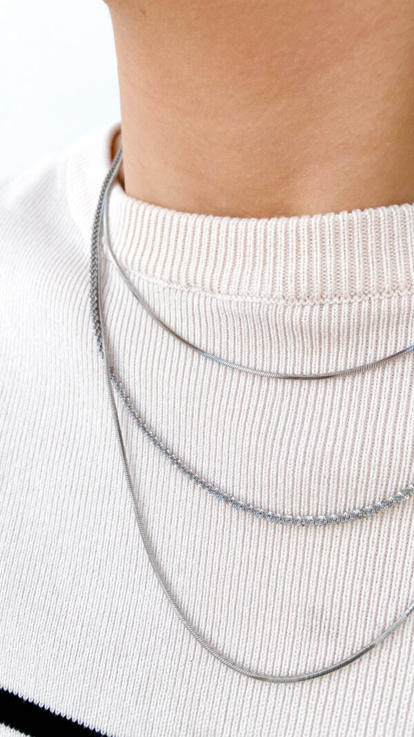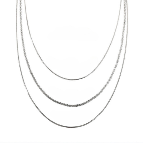 Odkryj nasz potrójny naszyjnik ze stali szlachetnej w pięknym srebrnym kolorze.