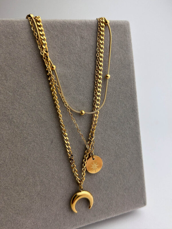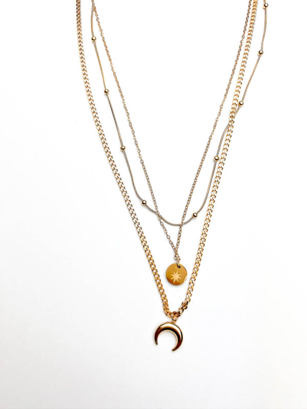 Odkryj nasz potrójny naszyjnik ze stali szlachetnej w pięknym złotym kolorze.